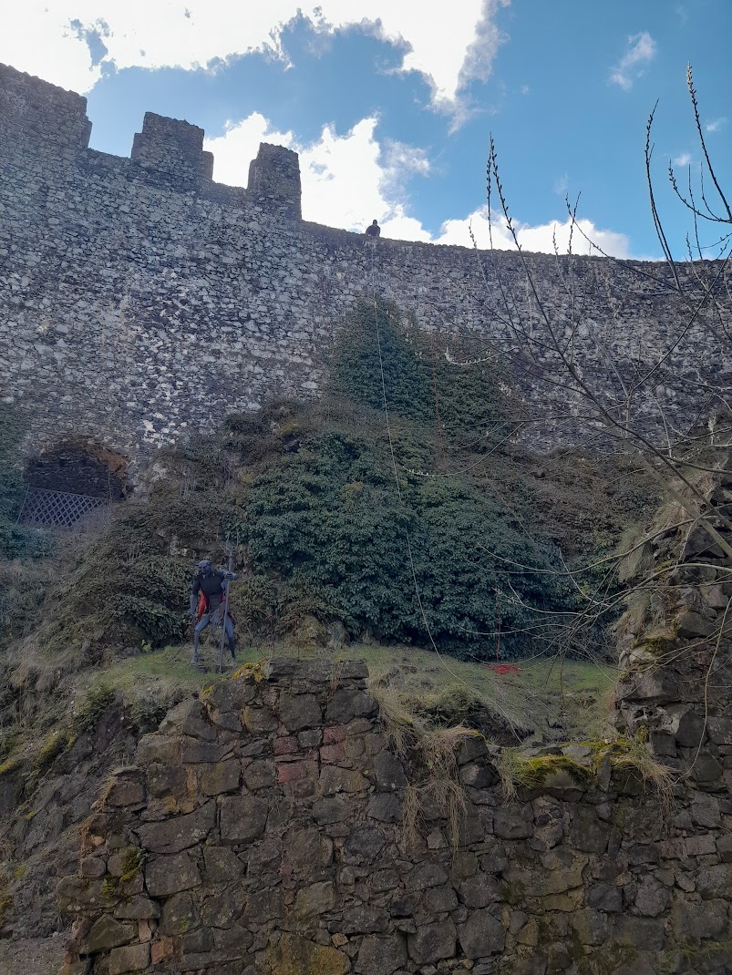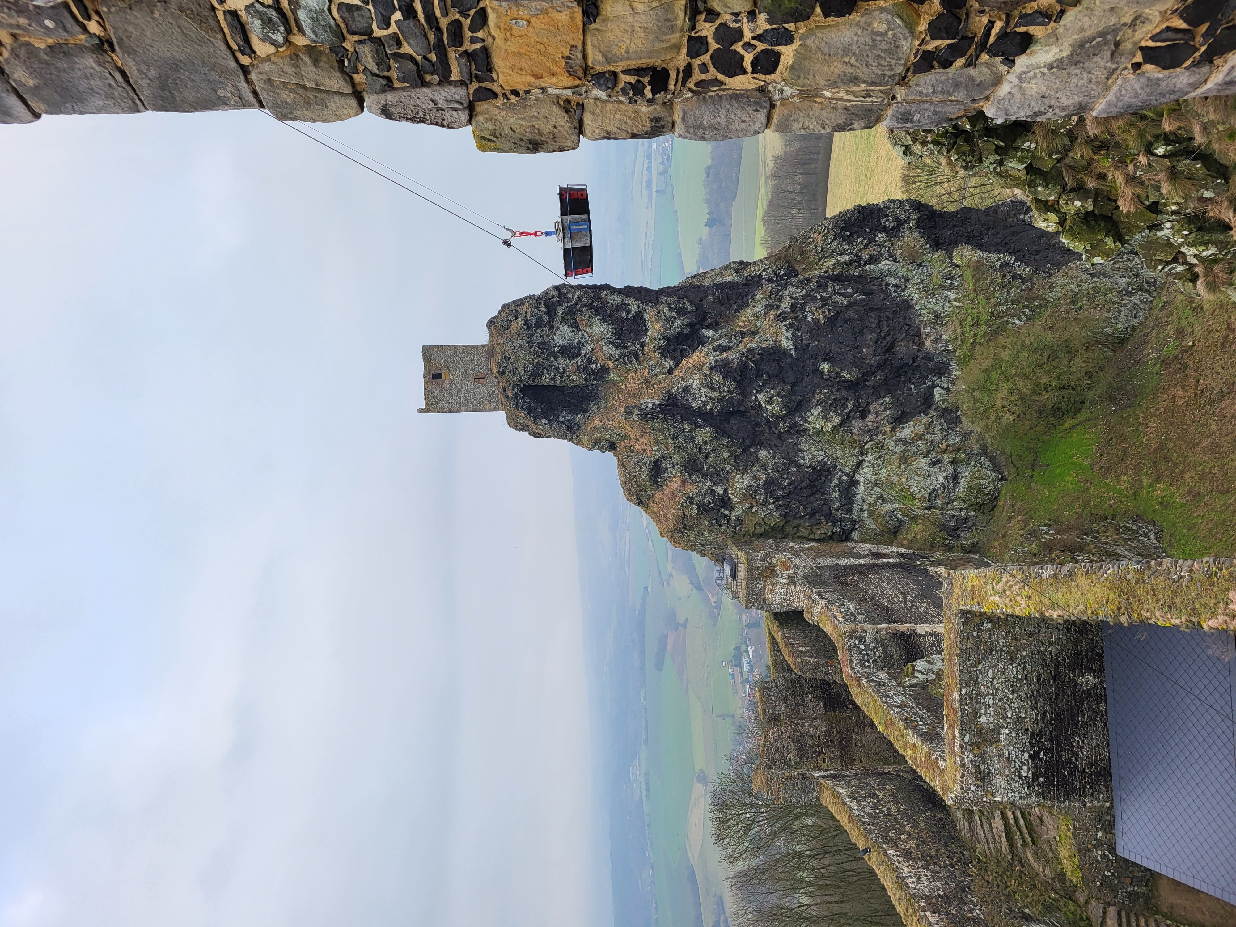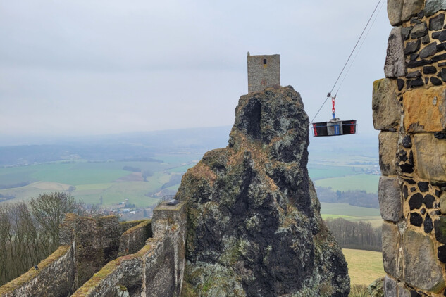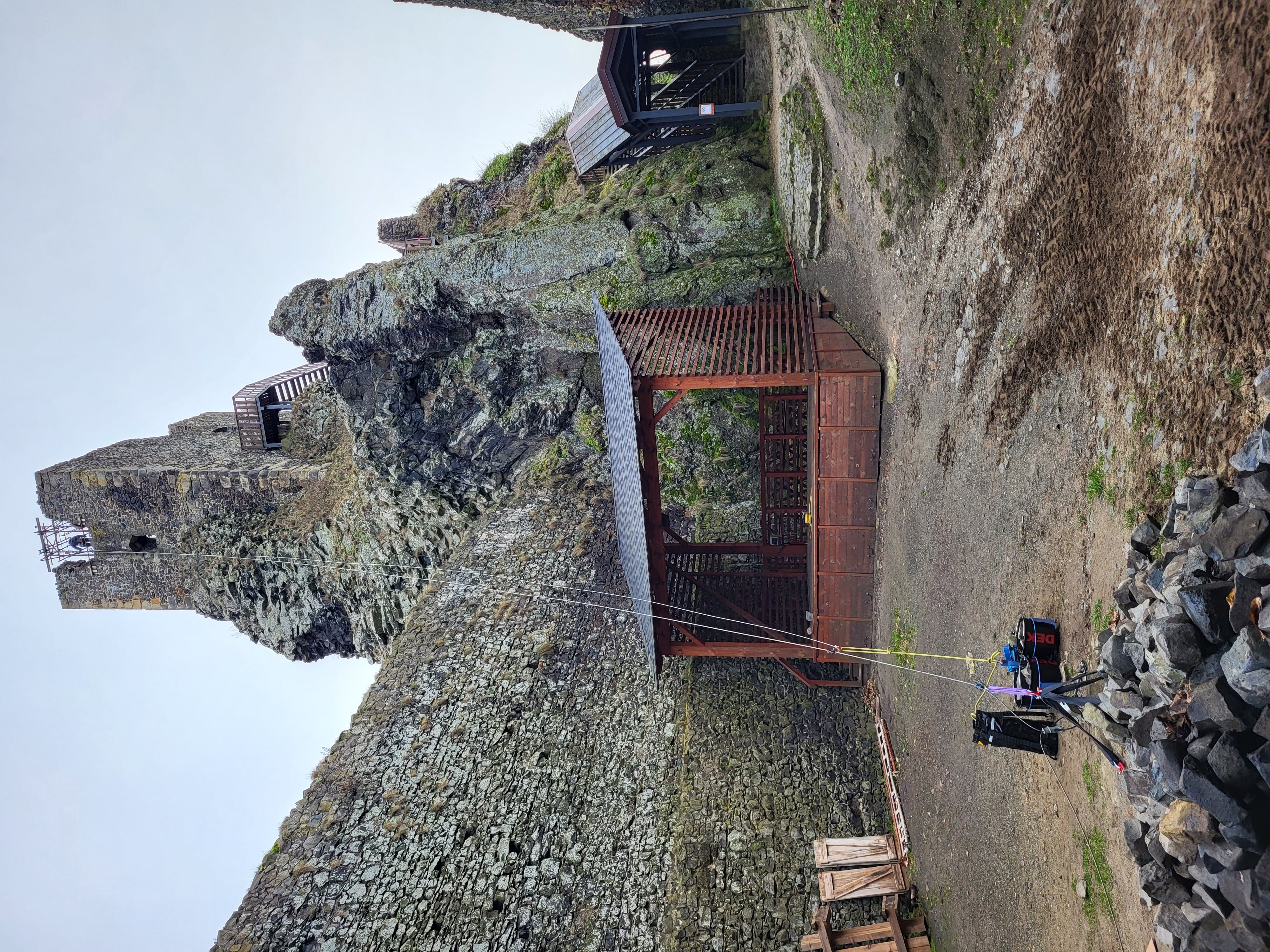 - Horní stanice lanovky byla až nahoře v "zubu" zdiva, na věži proto muselo být postavené lešení.