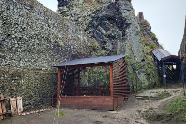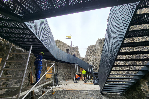 4. 8. 2022 jsme bohužel museli z důvodu havarijního stavu uzavřít původní dřevěný vyhlídkový ochoz. Od záři 2022 začala intenzivní komunikace o projektování nového ochozu. Protože jsme chtěli předejít dalším potížím a časté údržbě, kterou dřevo vystavené extrémní povětrnosti vyžaduje, rozhodli jsme se zvolit moderní a trvanlivou ocelovou konstrukci. Stavba ochozu navazovala na realizaci odvodnění a zadláždění věže.