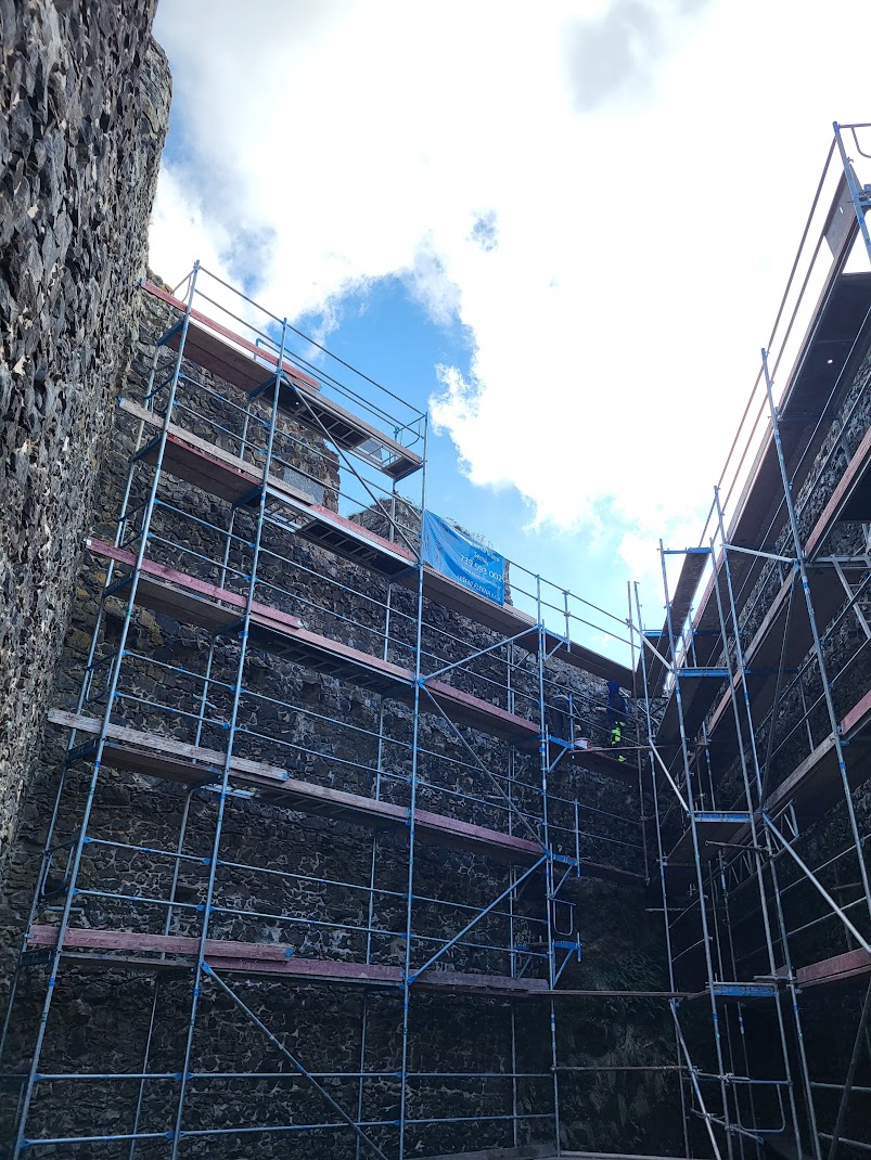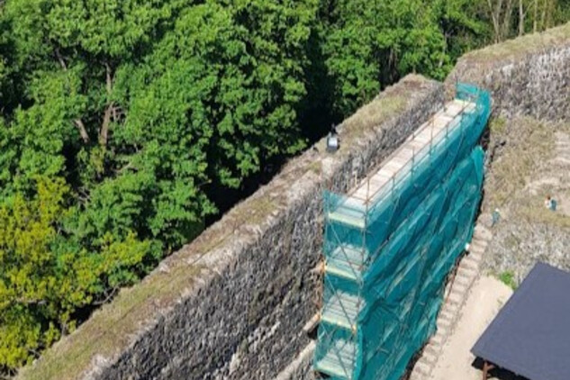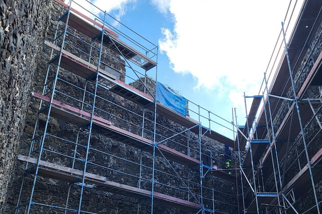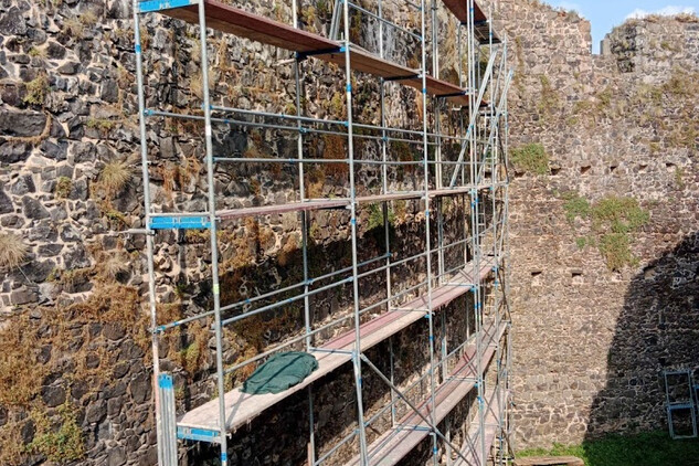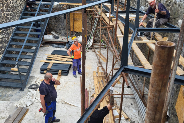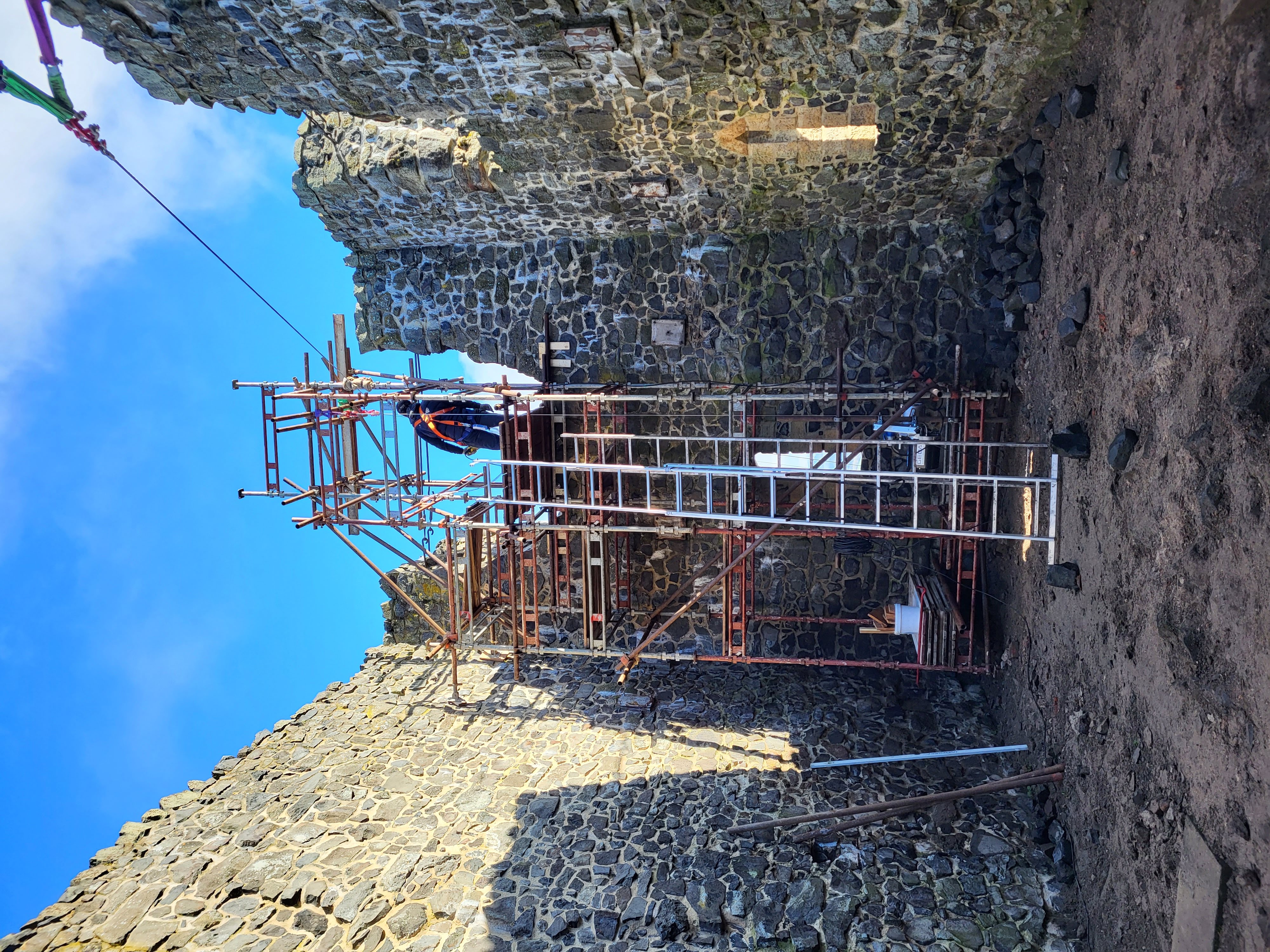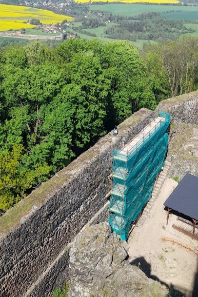 - Na nerovném terénu podél hradeb je často komplikované postavit lešení. Pro pány lešeňáře je to vždy výzva. Nehledě na to, že jednotlivé díly konstrukce lešení nosí pěšky z prvního nádvoří na místo oprav.