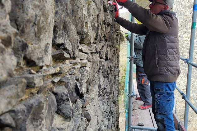Hradební zdivo potřebuje průběžnou péči. Kamenné středověké hradby byly stavěny tak, že zatímco líce byly důkladně vyzdívány na maltu, jádro hradby bylo skládáno nebo sypáno z nesourodého materiálu - jílu, kamenů, maltoviny. Vlivem vlhkosti a povětrnosti se stává, že spáry z malty v lícovém zdivu se sypou, kameny se uvolňují, líc se může například vlivem prorůstání náletů oddělit od jádra, hradba se pak stává nestabilní. To vše jsou důvody, proč je hradební zdivo průběžně přespárováváno, případně i lokálně dozdíváno. Jsou na to přesně dané postupy odsouhlasené odborníky z oboru památkové péče. Vždy je potřeba danou hradbu důkladně očistit od zeleně, poškozené spáry vyškrábat, vyplnit maltou a uhladit. Je to mravenčí práce a než bude tímto způsobem opraveno veškeré hradební zdivo na Troskách, bude to ještě pár let trvat.
