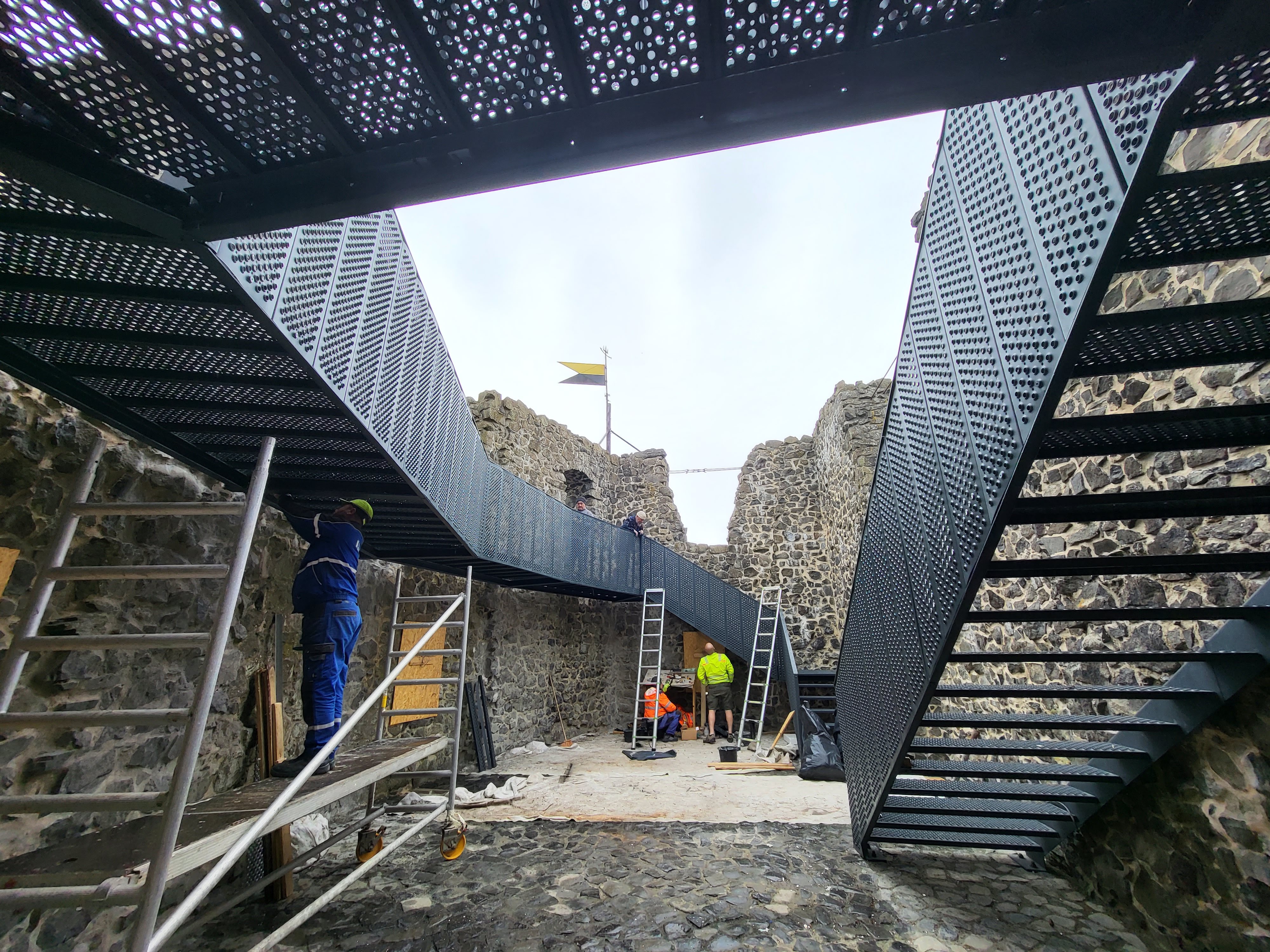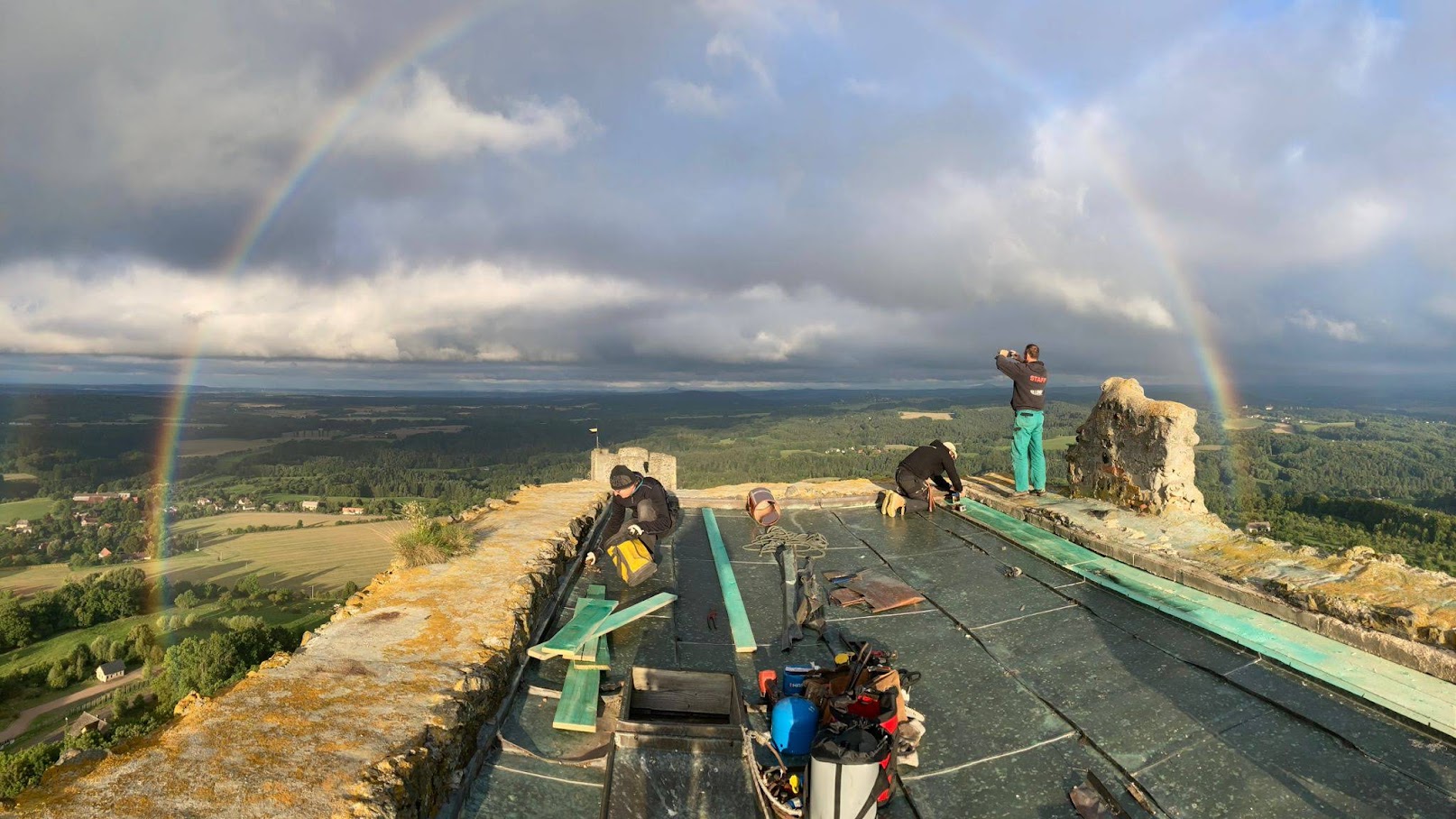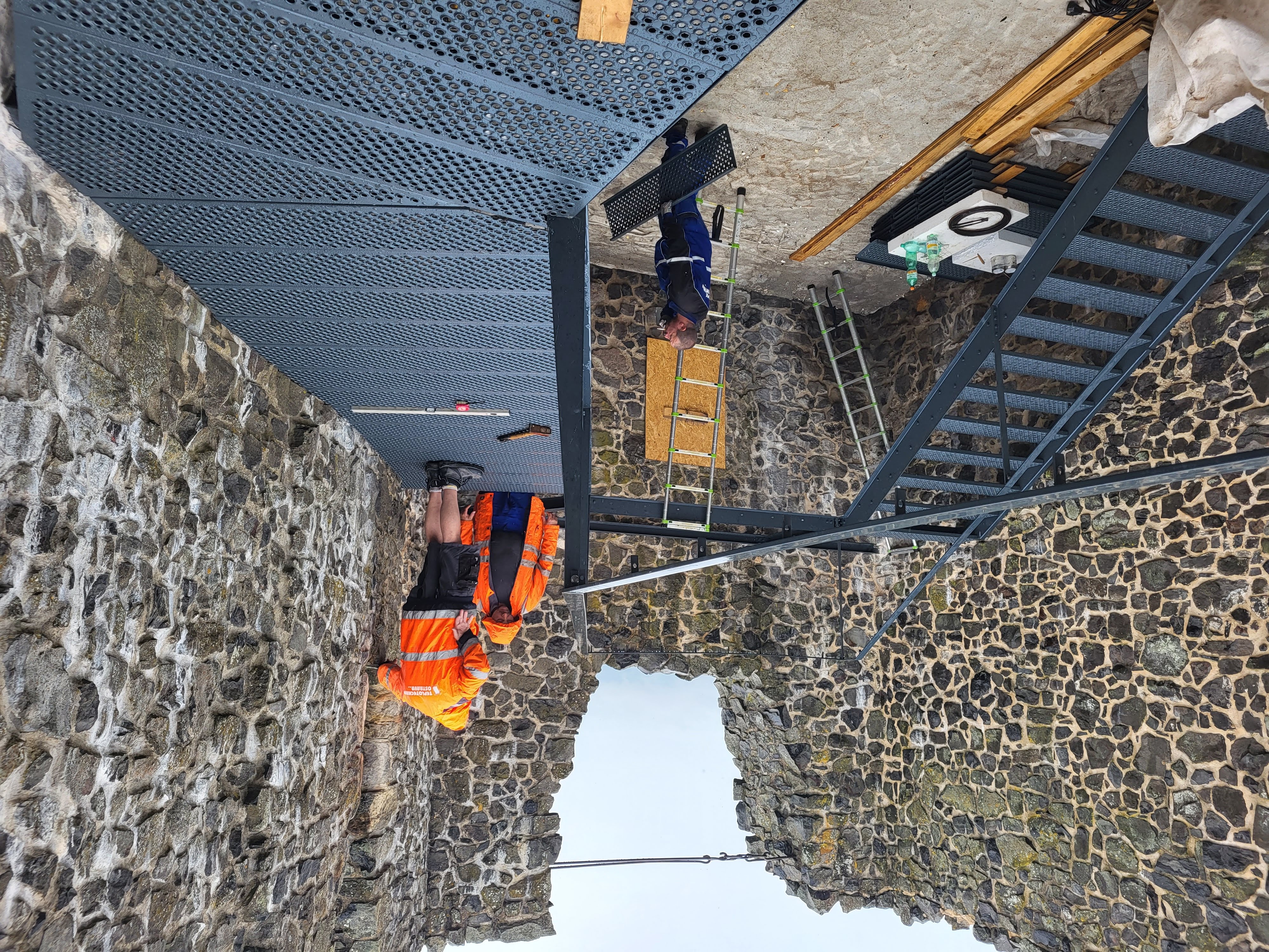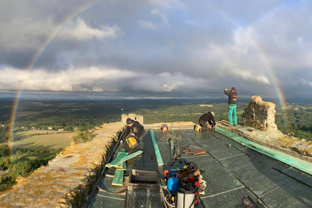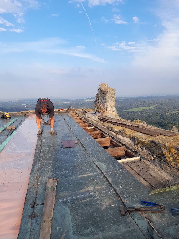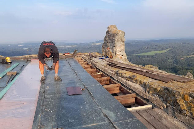 Tohle byla výzva. Většina tesařů a klempířů je zvyklá pracovat ve výškách, jen málo z nich ale běžně dělá na věžích, a skutečnou výjimkou je pro ně práce na střeše věže, která stojí na vysoké skále. Do střechy vlivem stáří zatékalo, místy začínal trouchnivět krov, některé trámy již potřebovaly vyměnit. Bylo také potřeba vyměnit jeden pás měděné krytiny a přetěsnit spoje. Vše se podařilo a střecha bude ještě mnoho let sloužit.